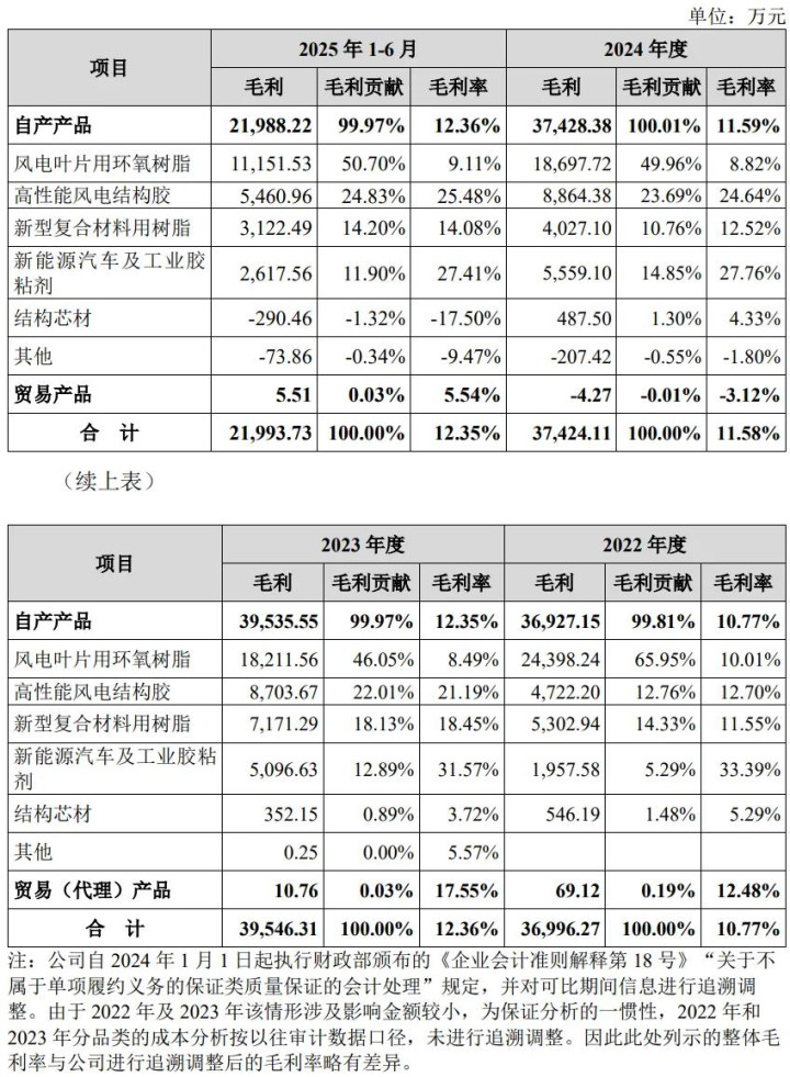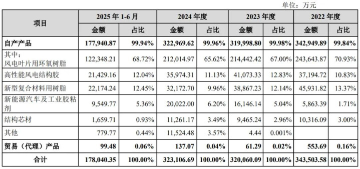 公司产品属于新材料,按照应用分为风电叶片用材料、新型复合材料用树脂 和新能源汽车及工业胶粘剂三大系列,目前主要应用在包括风电、新能源汽车、储能、氢能等在内的新能源领域,以及航空、油气开采、电力、模具制造等领域。